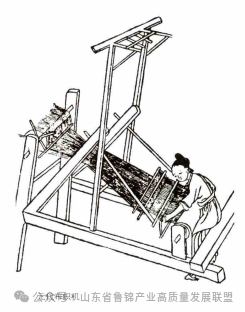鲁锦的织机为木制立式织机,与山东汉代石刻中脚踏提综斜织机相比,它已经形成固定的交织综与提花综,在中原各省普遍流行。大约在春秋战国时期我国已在手提综开口(原始腰机即属此类织机)的基础上,发明了脚踏提综开口的踏板织机,因织机的经面与水平机座呈50°~60°的倾角,故又称“斜织机”。斜织机在我国汉代已普遍推广,在中原农村较富裕的家庭中,大都使用这种结构基本定型的斜织机。与构造简单的原始腰机不同,斜织机是一种配备有杼、经轴、卷轴、综片(织机上带着经线上下分开形成梭口的装置)、踏板和机架的完整织机。它采用物理学上的杠杆原理,用脚踏板来控制综片的升降,使经纱分成上下两层,形成一个三角形开口,以织造平纹织物。汉代斜织机最主要的类型是中轴式斜织机,织机的两个踏板均用绳子或木杆与一根中轴相连再由中轴来控制综片开口。斜织机采用脚踏提综开口装置,将织工的双手解脱出来,专门从事引纬和打纬的工作,它大大地提高了生产效率,并促进了引纬、打纬工具的进一步革新。配置花样时从穿综开始,所以妇女们很重视穿综技术喜欢收集各种样底。织机的定幅(俗称“机柱”)由竹片制成,它决定着经纱的幅宽和方向定位。定幅箱的打纬力度决定织物的平整度、均匀度。此外有机头、布头轴、压纱棒、吊综用的“屋花子”和梭板等主要部件。织工坐在机板上,双脚踩动机头,双手投梭,进行有节奏的织造。