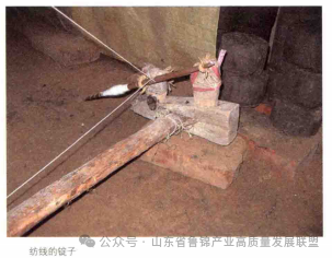 纺线工序就是将弹好的棉花用纺车纺成细长的棉线。纺车由辐条、车脚、脚丫三部分组成。辐条由八根木片组成,用线绳连接,辐条中间由木轴穿插固定车脚用来连接辐条和脚丫,纺车脚丫主要是用来固定锭子的。
