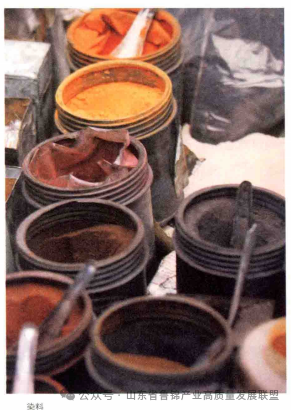 化学颜料的出现使得鲁锦的色彩真正丰富起来。鲁锦常用的颜色主要是大红、桃红、湖蓝、靛青、草绿、茄紫、杏黄、棕、白、黑等。染线前要把打好的纱线桃放在水里充分浸泡,并拿出来反复用洗衣棒捶打,然后拧水晒干。这样的处理相当于现代染色前的煮练,主要是破坏棉花的蜡质层以及去除面纱里的杂质,使棉纤维具有更好的吸水性,方便染色时纱线上色。染线时一般使用铁锅加热,锅内放入清水,加热成温水后将按照比例配好的染料下锅,待煮开后将打好的线桃放入。边煮边搅拌,尽可能让纱线充分吸附颜色,并达到均匀上色的目的。为了增加色纱的色牢度,还要酌情添加盐和白酒,可以达到固色增艳的效果。民间染色通常使用的是直接煮染,采用大锅煮染,染一次深一层色,色浓度虽然较好,但由于手工掌握不够规范,常常造成色彩不匀、牢度不够有褪色现象的缺点,影响了织物的效果,因此家染的鲁锦布料不耐水洗,容易出现褪色和相互浸染的现象。近年来,随着棉纺染色技术的进步,鲁锦织物的色牢度才有了较大的提高。现在一般均是由组织生产的公司向印染厂购买色纱从而解决染色问题。