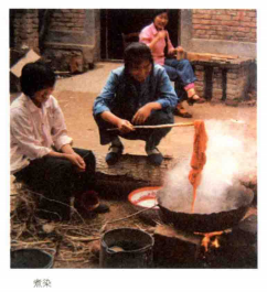 旧时的民间染线品种很少,颜色也很单一。纱线的上色依靠石榴皮染出青黑色,槐米或黄土染成黄色,靛蓝染蓝色,其中最有代表性且质量较为稳定的染色方法是靛染。靛染工艺历史悠久,蓝靛的植株称“蓝”,在我国已有3000多年的栽培历史,在古代的印染工艺中,蓝靛是应用最广泛和最重要的一种植物染料。早在夏代,我国就已经开始种植蓝草用于染色了。此后,随着染料生产及使用技艺的进一步发展,秦汉之后,人们又懂得了用酒糟还原蓝靛染色(靛)的机理,使靛能长期保存,使用范围更加广泛。当地的靛泥生产和使用技艺与史书记载的靛泥生产和使用技艺相差不多,可以说是传统靛泥生产和使用技艺的活化石。在漫长的历史岁月中,生产力发展水平极为低下,农民家庭经济收入不高,为了及时解决好穿衣难的突出问题,这种以种植蓝靛及蓝靛染料制作工艺为主导的农产方式便在自给自足的生活中起到了极为重要的作用。