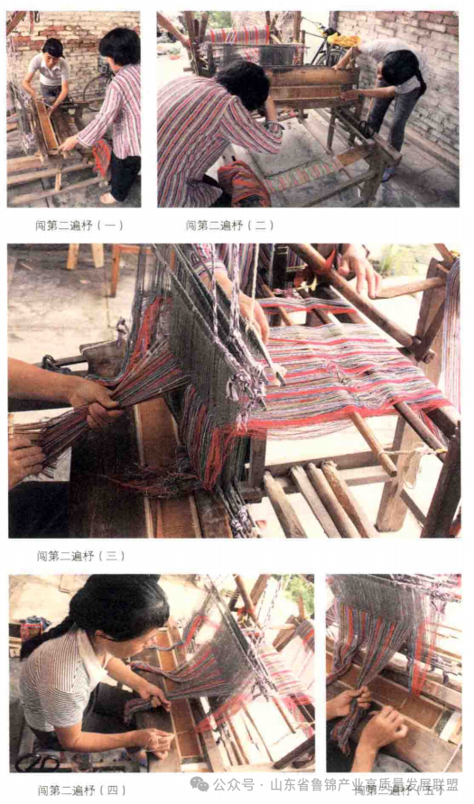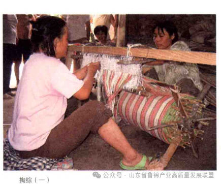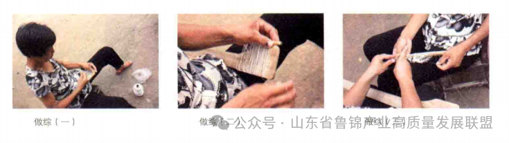 综是上下提拉经线的部件,它的作用是分开经线让梭子穿过,然后合上经线锁住纬线。要把综片按图案要求分别在机楼上下连接踏板。然后将卷线轴放在机头部。综片的多少决定了经线分开的层次和织造图案的复杂程度。使用两片综提合经线织出的布是平织布,只有使用四片及以上的综片提合经线织出的布才是提花锦。鲁锦就是应用四片综或六片综织造出来的,因此它比普通的手织布有更强的艺术创造力和艺术表现力。综的制作过程称为“做综”,人们旧时使用的全部是线综,即用自己纺线合成的细线绳在综线板上手工编结而成。先将一根粗铁丝或粗竹条与综线板并列在一起,把棉线一端固定编结到铁丝或粗竹条上,然后把棉线从做综板上绕一周后再次将线绳编结到铁丝上,然后循环往复这个过程,直到把需要制作的全部编结完成。一片综需要两组这样的综交叉才能使用,因此待第一片综被编结好后还要进行合综,合综就是在制作第二片综的同时把两片综褛交叉结合到一起。合综时综被的编结过程是一致的,不同之处是每结一个综裱线绳都要从相对应的另一片综被中穿过。每一个综只穿一根经线,15 帖的幅宽要编结 600 对线才能满足提拉经线的需要。织造平织布需要两片综,每片综可以提拉的经线数为 300对。鲁锦织造一般要使用四片综,因此每片综的经线数为 150 对。