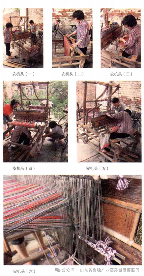 鲁锦织机是木结构的,采用当地出产的枣、槐木等硬杂木制成,结构简单,但结实耐用。织机一般长 1.8米,宽0.8米,高1.7米。主要部件有:机身、蚂蚱腿、机楼、滑子、圣花、综棍、综片、脚蹑、卷布轴、绳框、坐机板。除了织机机身框架是固定在一起的,其余各个部件都可以随意拆装。织造工序从掏综开始,就主要在织机上进行了。综片的吊装是用较粗一些的线绳系牢综片的两端,用机楼顶端放置的滑子上的吊钩勾到线绳的正中位置,并且要保持综片的平行,防止织布时出现织口打不开的情况。综片的悬挂是两个一组,共两组四片。每片综片下端正中还系有线绳与脚蹑子相连,通常脚蹑子的排列从右到左依次是和第四、三、二、一片综对应。织布时,织工踩下两个脚蹑,带动相连的两片综片下沉,另外两片综片上升,拉动经线形成织口。
